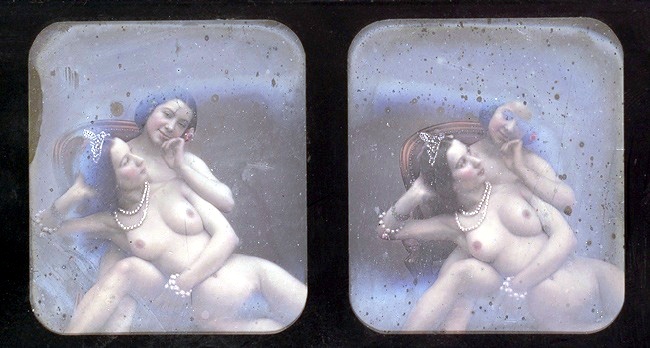 Комментарий музея. Сочетание дагерротипа (с его прекрасным исполнением деталей) и стереоскопии (с ее трехмерной иллюзией и неопределенностью масштаба) оказалось привлекательным для производителей и потребителей эротического искусства. Стереоскопические дагерротипы часто украшены тонким ручным раскрашиванием, имитирующим естественные тона кожи, с цветными и золотыми штрихами на жемчужных ожерельях, драгоценных подвесках и сверкающих диадемах, которые были частыми атрибутами модели.