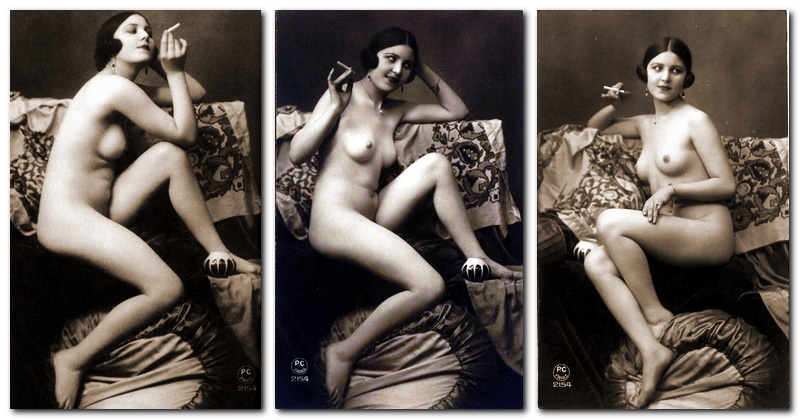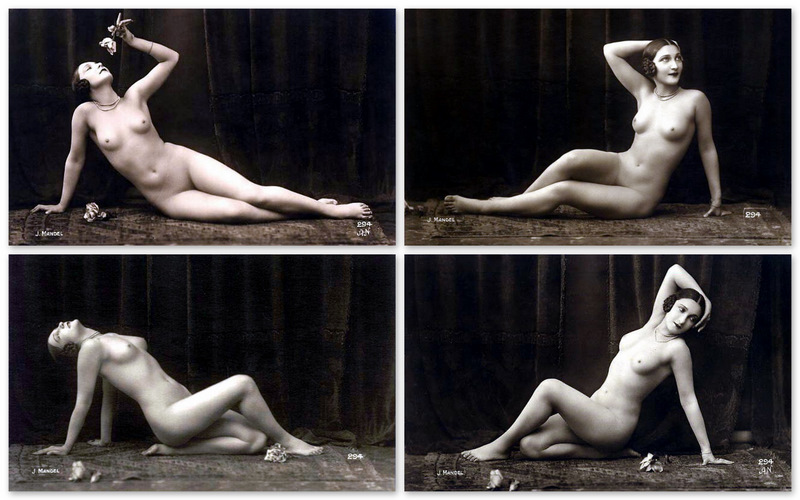 Рисунок 10. Фотографии (открытки) 12 неизвестной студии (серия 837). Фотомодель — Жюли Жанна Жюйя. Для фотографий, показанных на рис. 10-12, скорее всего, следует указывать дату: «1931 год или позже». Предположение о том, что сотрудники ведущих парижских студий специально выискали красивую девушку-провинциалку и «уломали» ее фотографироваться обнаженной, выглядит неправдоподобно. Судя по многочисленным фотографиям, дошедшим до нашего времени, у студий не было затруднений с моделями для эротических съемок. Другое дело, — победительница престижного европейского конкурса, прошедшая жесткий многоступенчатый отбор, внешние данные которой признаны одним из «эталонов» красоты того времени. Такая модель, безусловно, была востребована, в том числе и для фотографий в стиле ню. Можно предположить, что начало эротическим съемкам было положено в уже упоминавшейся «Alfred Noyer Studio», которая делала портреты девушек-конкурсанток. В частности, не вызывает удивления то, что столь именитая модель могла позировать (позировала?) Джулиану Манделю (Julian Mandel) — популярному фотографу начала 20-го столетия, который специализировался исключительно на женском ню, и издавал свои работы через парижские студии «Alfred Noyer» и «Carte-Postale» (PC Paris). Возможно, фотомодель с жемчужным ожерельем и миниатюрным кулоном на ажурной цепочке также позировала в студиях «Corona»,«Super» и «Leo of Pradet», но несколько позже. Женщина, на фотографиях этих студий, имеет некоторое сходство с Ж. Жюйя, но выглядит старше. Встречаются эротические фотографии Ж. Жюйя и анонимных производителей. Но наибольшее число фотографий, безусловно, сделано студией «PC Paris», которая была одним из крупнейших производителей фотографической продукции во всех жанрах.